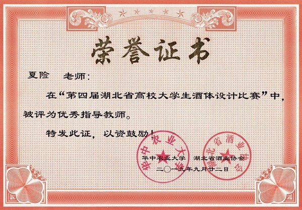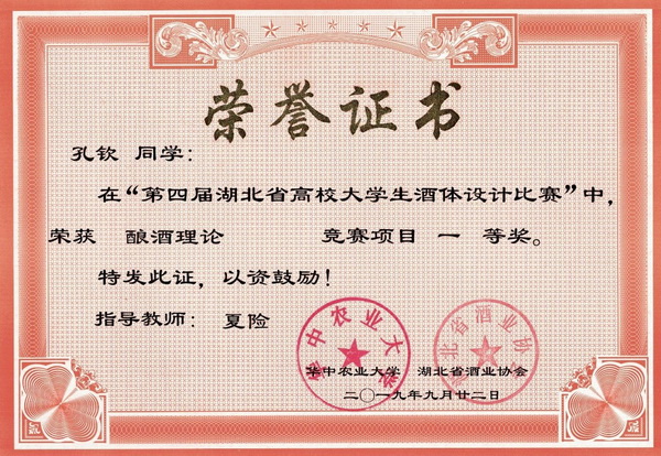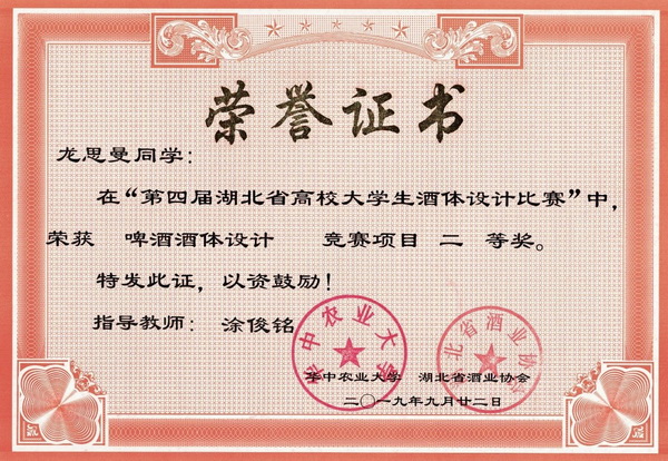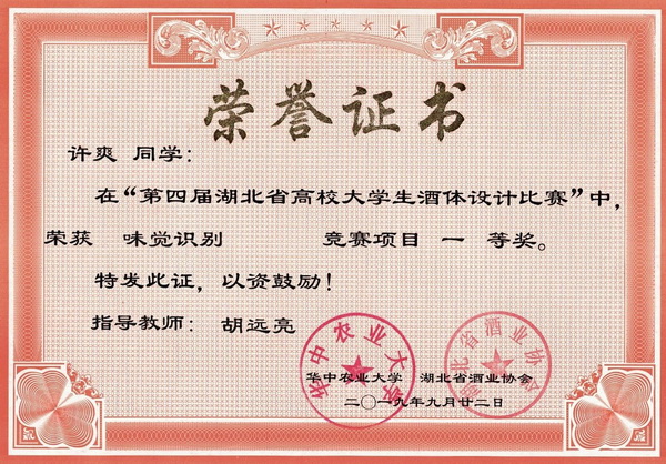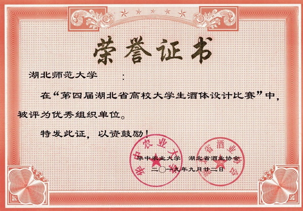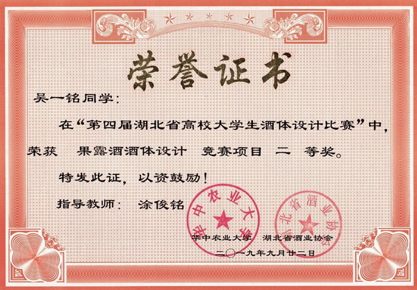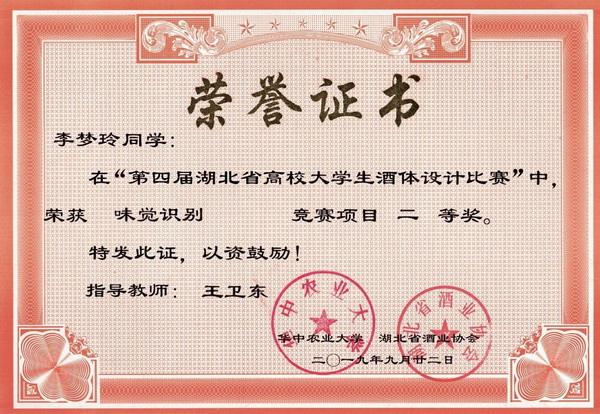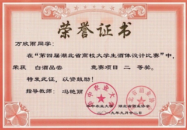 第四届湖北省高校大学生酒体设计大赛获奖证书