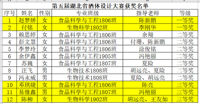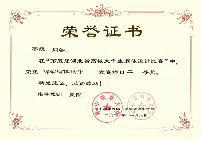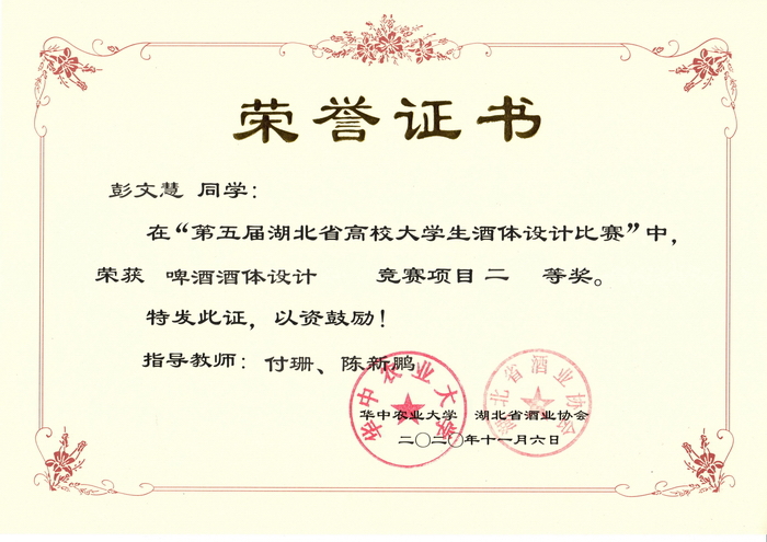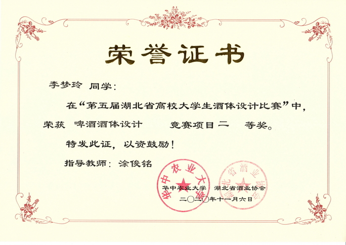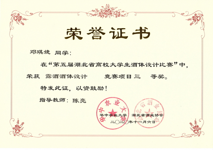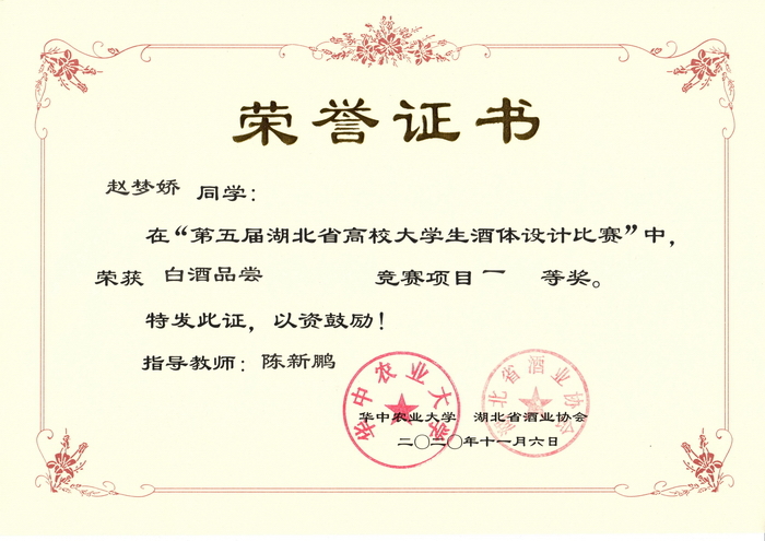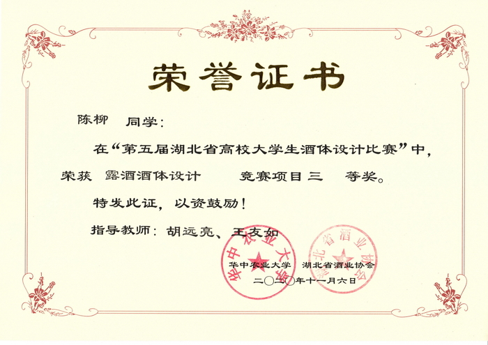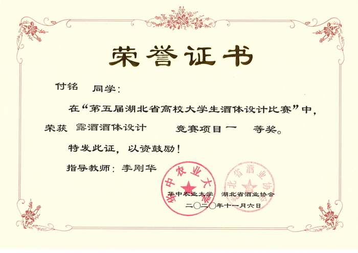 第五届湖北省高校大学生酒体设计大赛获奖证书