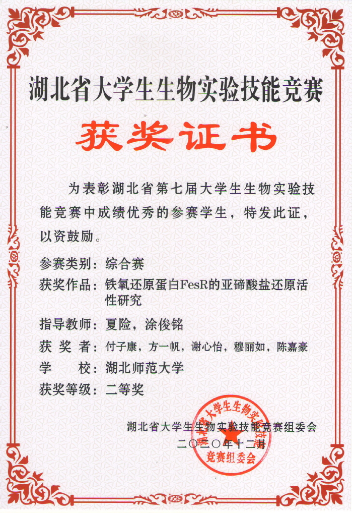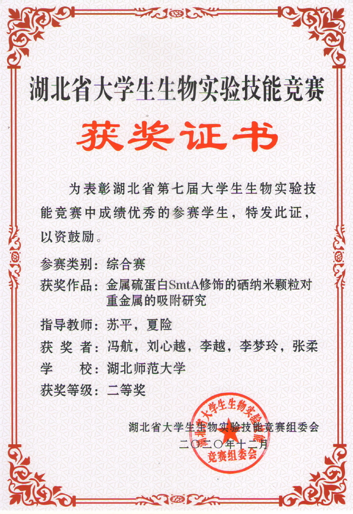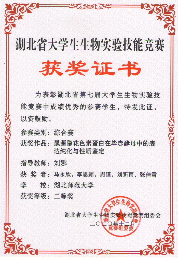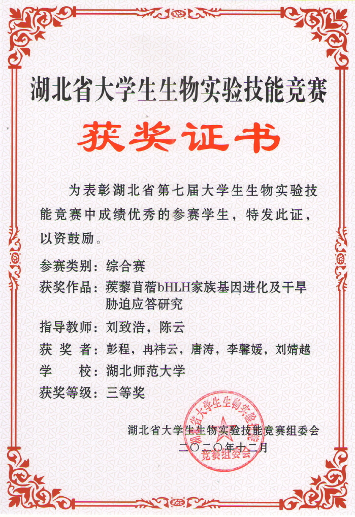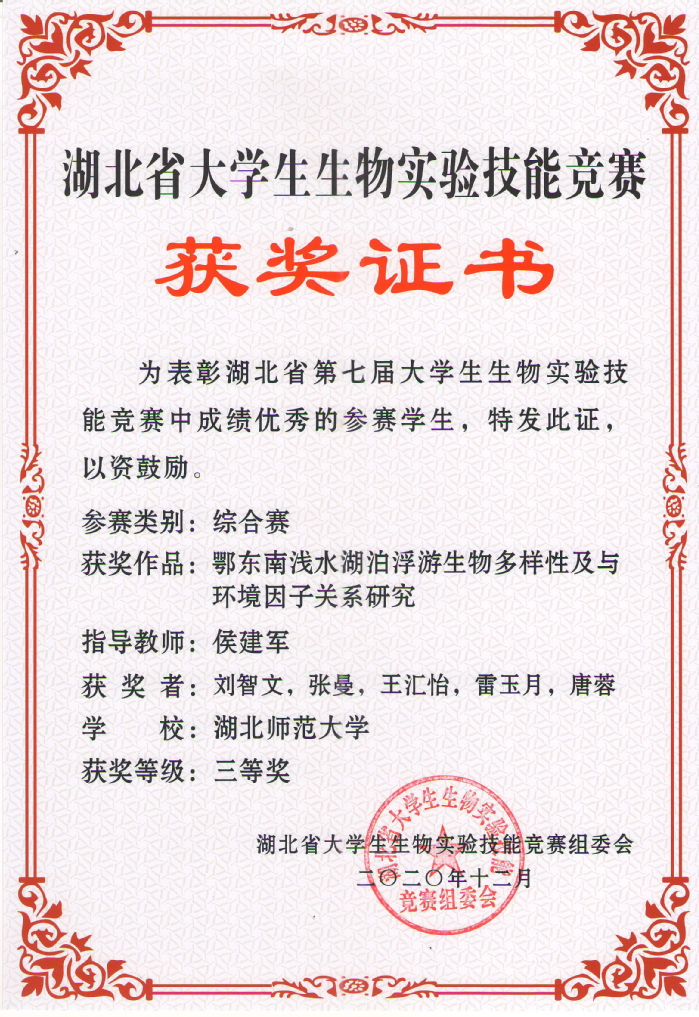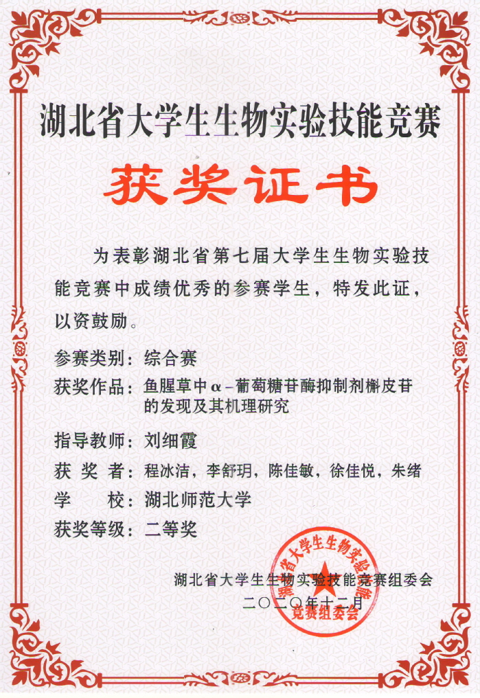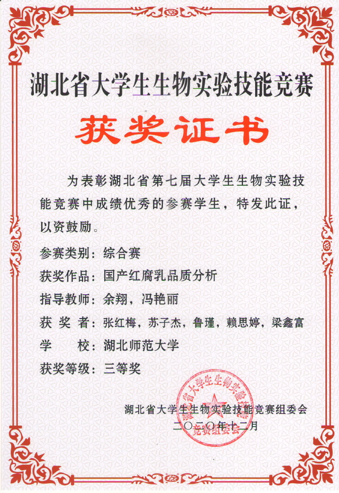 2020湖北省大学生生物实验技能竞赛综合赛获奖证书
