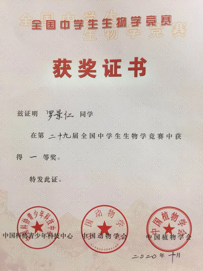 由yl23455永利官网培训的黄石二中罗景仁同学在全国生物奥赛冬令营中喜获金牌,并以湖北省第一名成绩入选国家集训队,成功保送清华大学。