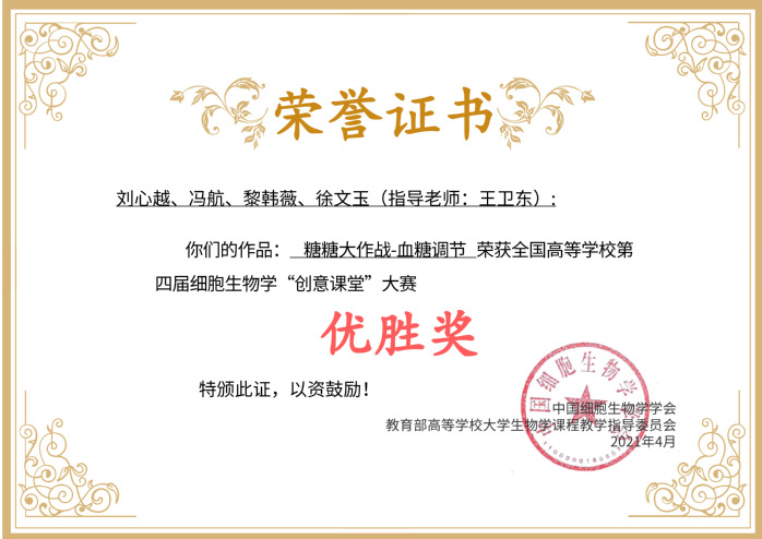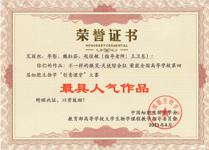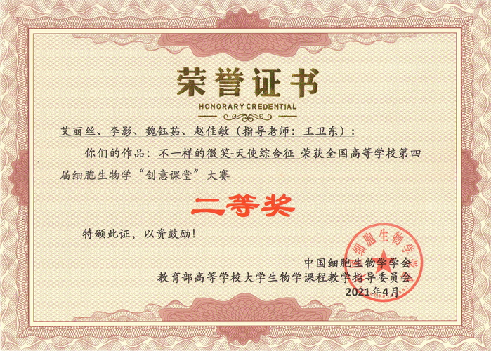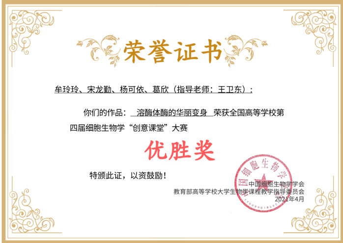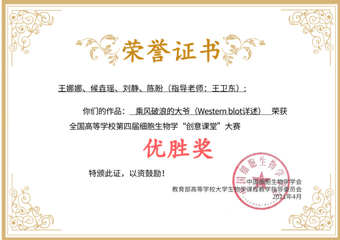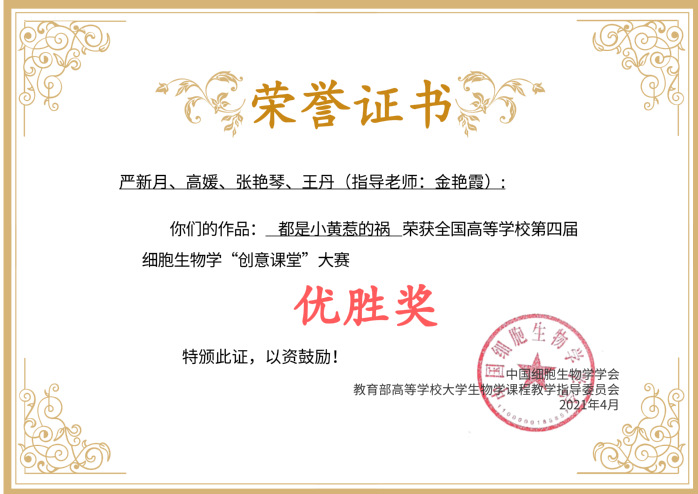 全国高校第四届细胞生物学“创意课堂”大赛获奖证书