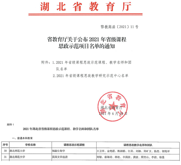 近日,省教育厅发布了《关于公布2021年省级课程思政示范项目名单的通知》(鄂教高函〔2021〕11号),yl23455永利官网《细胞生物学》入选省级课程思政示范课程,相应的负责人、团队自动认定为课程思政教学名师和教学团队。据悉,此次全省共评选出本科课程思政示范课程41门。