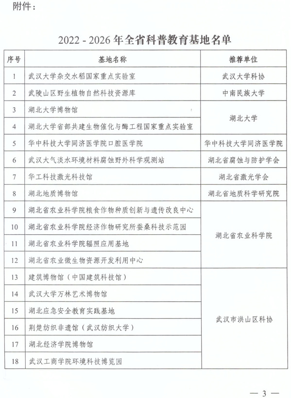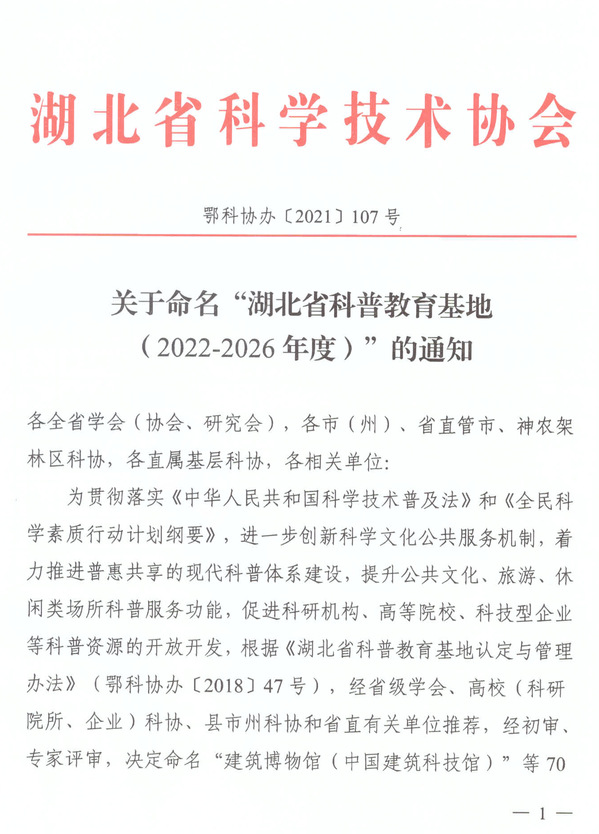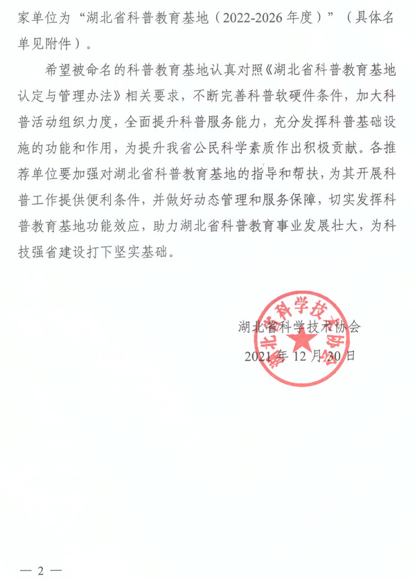 近日,湖北省科协印发《关于命名“湖北省科普教育基地(2022—2026年度)”的通知》(鄂科协办〔2021〕107号),yl23455永利官网生物标本馆被命名为2022-2026年度湖北省科普教育基地。