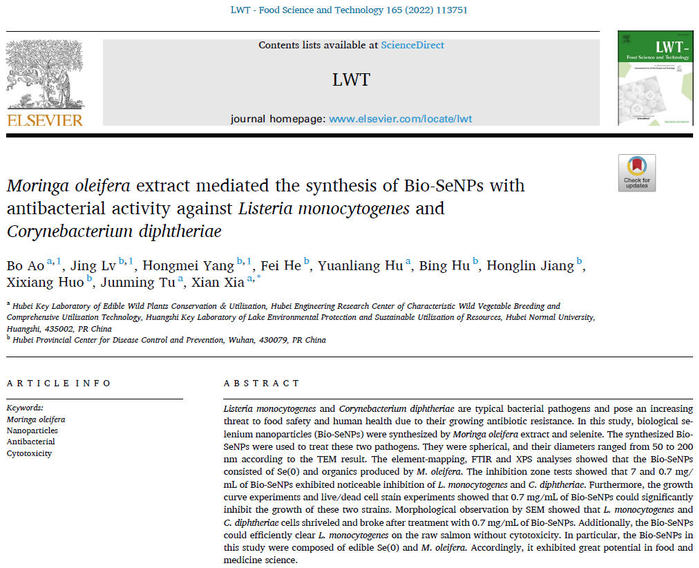 近日,yl23455永利官网与湖北省疾病预防控制中心联合在国际期刊《LWT-Food Science and Technology》(中科院一区TOP期刊,IF:6.0564)在线发表题为“Moringa oleifera extract mediated the synthesis of Bio-SeNPs with antibacterial activity against Listeria monocytogenes and Corynebacterium diphtheriae”的研究论文。夏险副教授为通讯作者,yl23455永利官网硕士研究生敖波,湖北省疾病预防与控制中心吕静、杨红梅为共同第一作者,湖北师范大学为第一单位。