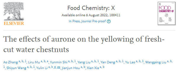 近日,湖北师范大学李煜林团队在《Food Chemistrty: X》(JCR1区,IF:6.443)上发表题为“The effects of aurone on the yellowing of fresh-cut water chestnuts”的研究论文。通讯作者为李煜林。其团队的张奥、穆丽茹、施运敏、刘洋、邓艳、劳玉、刘望平、王诗韵等8名本科生为共同第一作者。