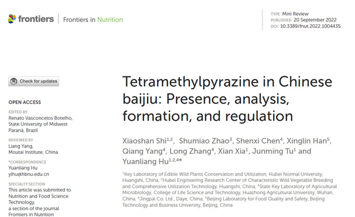 近日,yl23455永利官网石小杉博士研究团队应Frontiers in Nutrition(中科院一区TOP期刊,IF6.576)编辑邀请,与华中农业大学、劲牌有限公司和北京工商大学研究人员合作,在该期刊上发表题为“Tetramethylpyrazine in Chinese Baijiu: Presence, Analysis, Formation, and Regulation(中国白酒中四甲基吡嗪的存在水平、分析方法、合成机制和调控策略)”的综述论文。石小杉博士为第一作者,胡远亮教授为通讯作者,湖北师范大学为第一完成单位。