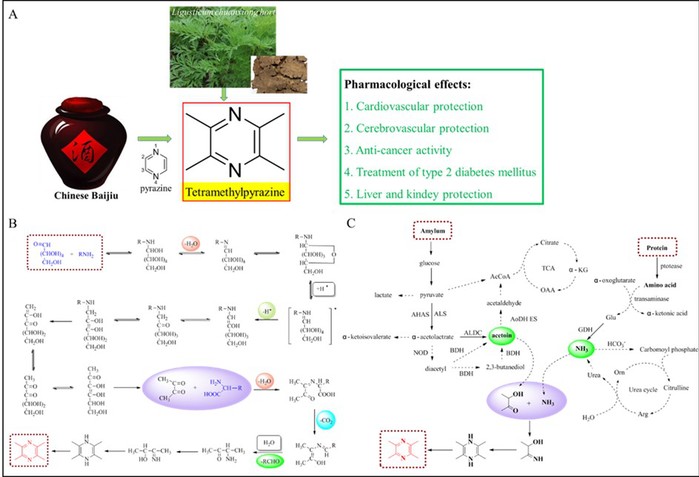 中国白酒是世界六大蒸馏酒之一,因其特有的口感和风格,在人们的日常生活和社会交往中占有重要地位。四甲基吡嗪(Tetramethylpyrazine,TMP)是最初从中药川芎中分离出来的一种活性药物成分,又名川芎嗪,不仅是中国白酒风味相关的重要化合物,同时具有特殊的药理作用,具有扩张血管、抑制血小板集聚、改善微循环及增加冠脉血和脑血流量等功能,可以预防心脑血管疾病、缺血性脑卒中、癌症和糖尿病等疾病。因此,它不仅赋予了白酒特殊的坚果香和烘烤香,而且赋予了白酒重要的保健价值。本文首次综述了近三十年来中国白酒中TMP成分的存在水平、分析方法、合成机制和调控策略等方面的研究进展,这些总结将促进人们对白酒中四甲基吡嗪更为深入的了解,有益于白酒中四甲基吡嗪含量的提高,进而提升白酒的品质。