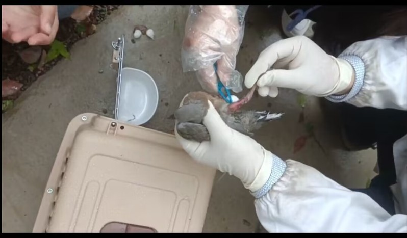斑鸠由西塞山八泉派出所于4月4日移送中心。其体型较小,通体灰色。经检查,腿部受伤较重,有进一步感染风险,支立峰老师与同学们一起对斑鸠伤口进行消毒,上药,包扎。