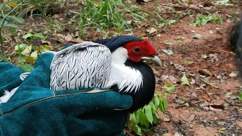 白鹇也是国家二级保护动物,由海观山社区工作人员在长江边发现,经黄石港区水利和湖泊局移交中心。该鸟为成年雄性,体长大概60cm,头顶红色具冠,腹部通黑,上体白色而密布以黑纹,具有白色长尾。因其移交中心前已多日未进食,身体较为虚弱,经全面检查,未发现受伤和患病,中心学生志愿者为其准备蚯蚓等食物,但进食情况不好。