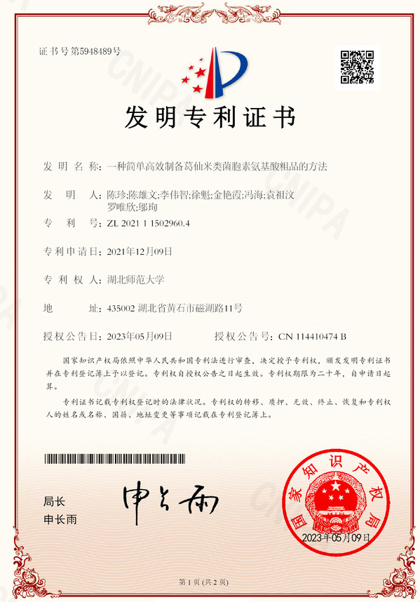 近日,从国家知识产权局获悉,陈珍博士团队的“一种简单高效制备葛仙米类菌胞素氨基酸的方法”成果喜获国家发明专利授权(ZL 202111502960.4)。这是继“一种室外栽培地木耳的方法”专利(ZL 2016 1 0038782.7)之后,陈珍博士团队在微藻研究领域取得的又一专利。