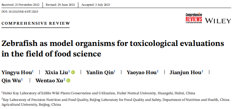 近日,yl23455永利官网刘细霞副教授研究团队在Comprehensive Reviews in Food Science and Food Safety(JCR Q1,中科院1区TOP期刊,IF 14.8)发表题为“Zebrafish as model organisms for toxicological evaluations in the field of food science”的综述性论文。yl23455永利官网2021级研究生侯莹钰为第一作者,湖北师范大学为第一通讯单位,刘细霞副教授和中国农业大学许文涛教授为共同通讯作者。