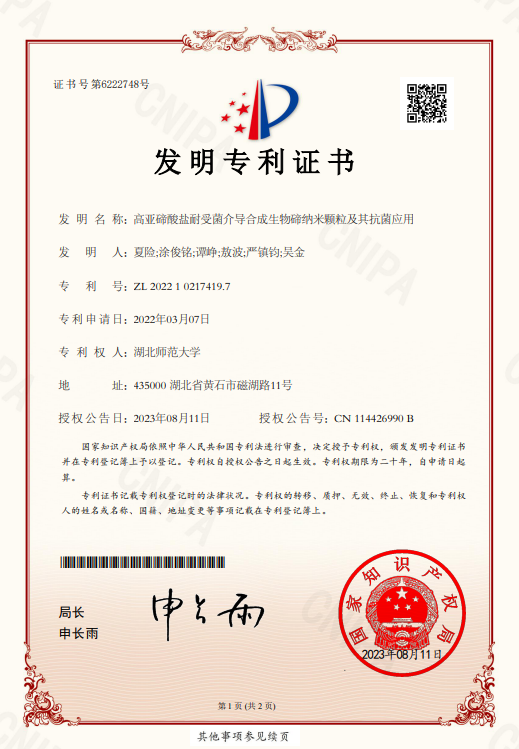 近日,夏险博士团队的“高亚碲酸盐耐受菌介导合成生物碲纳米颗粒及其抗菌应用”成果喜获国家发明专利授权(ZL 2022 1 0217419.7)。生物纳米材料,是一种纳米级的生物功能材料,通过绿色安全可持续方法,合成具有多种功能的纳米材料,将生物活性物质与纳米材料才结合,开发出多功能的新材料。