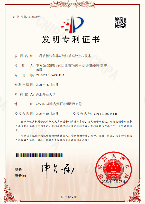 近日,从国家知识产权局获悉,王友如博士团队的“一种香椿枝条非试管快繁高效生根技术”成果喜获国家发明专利授权(ZL 2021 1 0649041.3)。