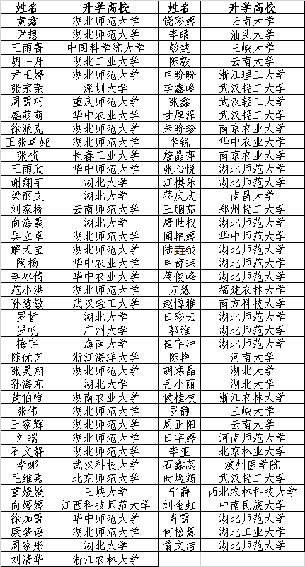 截至目前,共有81名学生收到拟录取通知,学院升学率达到30.8%,较去年增加8.5个百分点,学生上线录取率超过80%,20人考入双一流高校。生物科学专业2004班毛维嘉,以总成绩第一考入北京师范大学,食品科学与工程专升本2008班宁静,考入西北农林科技大学,老二栋614寝室四名男生全员考入湖北师范大学。