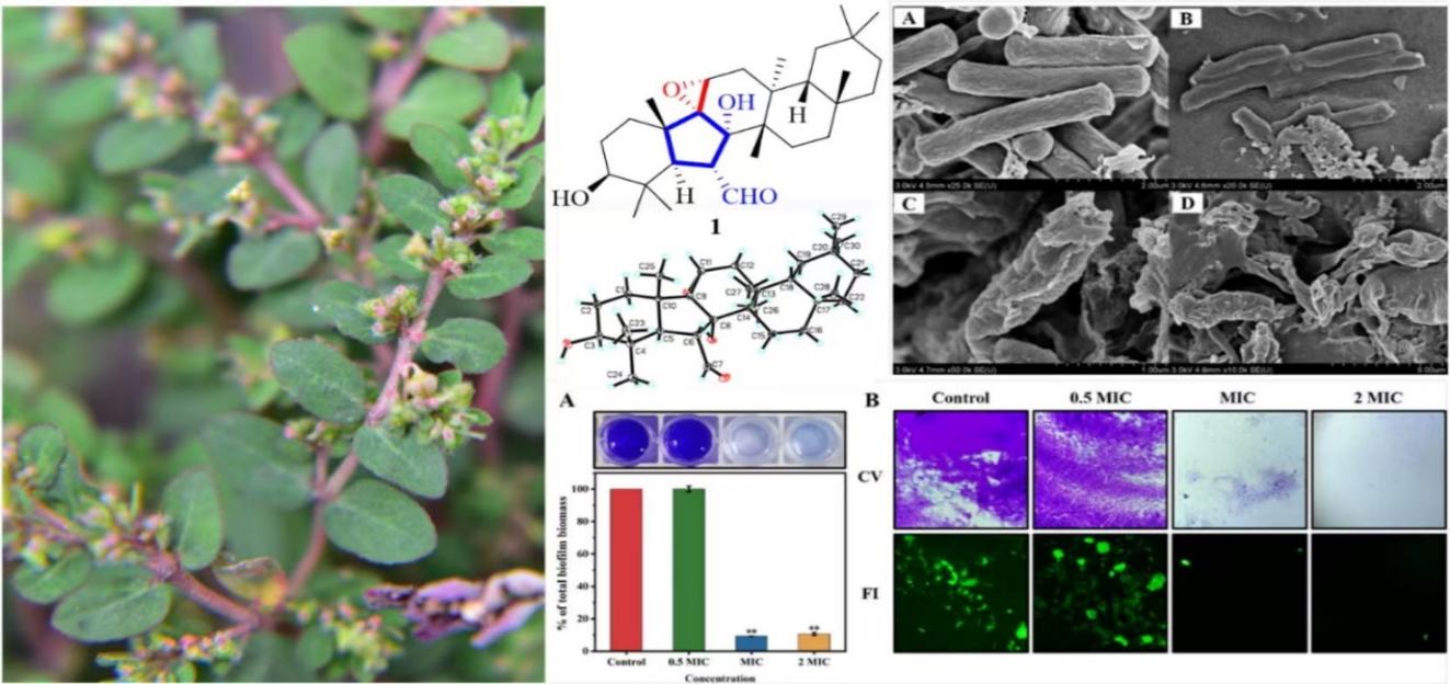 本研究对地锦草(Euphorbia humifusa)全株抗菌成分进行的探究,从中分离出了14种新的三萜类化合物,即地锦草素A - N(1 - 7 和 9 - 15),以及4种已知类似物(8 和 16 - 18)。通过对光谱数据的广泛分析以及采用铜Kα射线的X射线晶体学分析,确定了它们的结构。其中,地锦草素A(1)首次具有源自D:C - friedo - 齐墩果烷骨架的独特的6 (7 → 8) abeo 结构单元;地锦草素H 和 I(9 和 10)拥有源自25,26,27 - 三降达玛烷的罕见的α,β - 不饱和 - γ - 内酯链;地锦草素 L(13)是一种高度修饰的3,4 - 裂环 - 25,26,27 - 三降环阿尔廷烷。值得注意的是,在抗菌生物活性测定中,化合物1对蜡样芽孢杆菌、金黄色葡萄球菌和表皮葡萄球菌表现出优异的抗菌活性,其最低抑菌浓度(MIC)分别为12.5、25 和 25μg/mL,与阳性对照相当。在暴露于1MIC的化合物1时,蜡样芽孢杆菌发生了剧烈的形态变化,导致细胞完全破裂。同时,化合物1在1MIC浓度下对蜡样芽孢杆菌也表现出显著的抗生物膜活性。