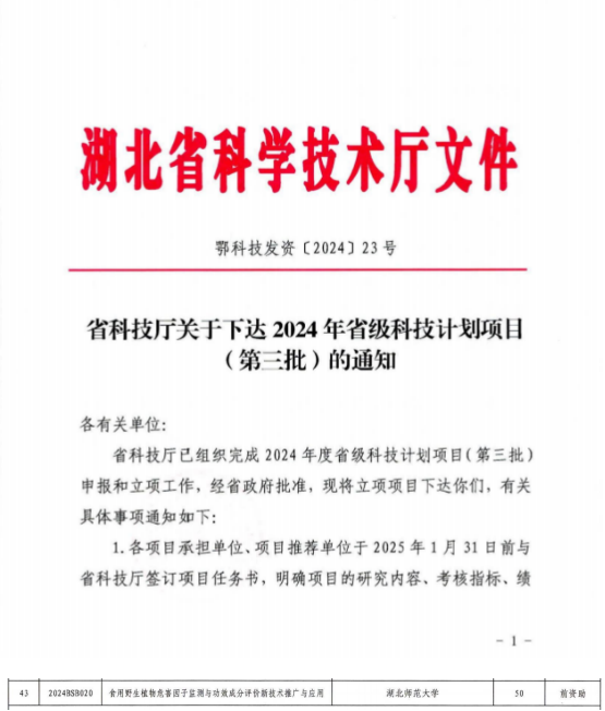 本网讯(通讯员 吴琴)近日,省科技厅正式下达了关于2024年中央引导地方科技发展资金项目的通知,其中,yl23455永利官网刘细霞教授负责申报的项目《食用野生植物危害因子监测与功效成分评价新技术推广与应用》成功获批立项,并获得50万元的技术创新计划资助。