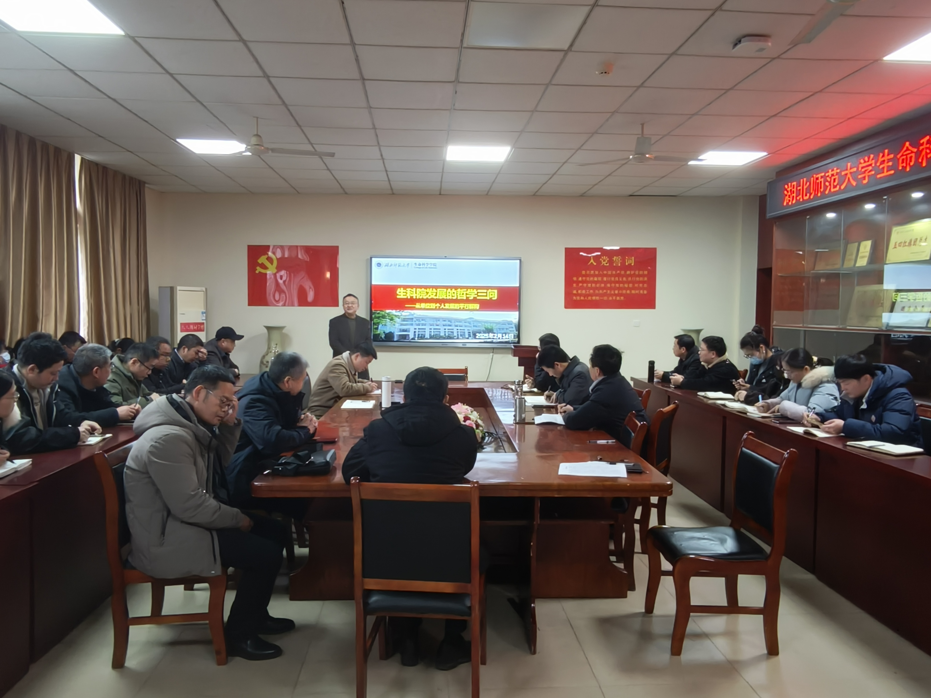 会议开始,侯建军教授以“生科院发展的哲学三问—从单位到个人发展的平行解构”为主题作专题经验分享。侯教授首先抛出“我是谁?我从哪里来?要到哪里去?”三个哲学问题,通过讲述学院建院历史、分析与兄弟高校综合能力比较等方面阐述了“我是谁?”的问题;通过讲述生科院发展历程、生科院现状成果、个人成长路径等方面阐述了“我从哪里来?”的问题;通过讲述生科院未来发展目标、教师个人发展与学院战略的协同、个人经验和反思等方面阐述了“要到哪里去?”的问题。侯教授提出了要“打好生科未来三大战役”:一是打好国家/省级平台项目检查验收、师资队伍稳定保障的保卫战;二是打好科研提质、人才破局的歼灭战;三是打好学科评估、学科排名、博士点立项建设的攻坚战。报告中,侯教授鼓励学院教师特别是青年教师们,要增强归属感、使命感、责任感,推动个人和学院的协同发展,实现学院使命与个人价值的共生进化,努力把生科院建设为高水平的地方师大生科院。侯教授的分享既有战略高度,又贴近工作实际,大家认真聆听并深受启发。