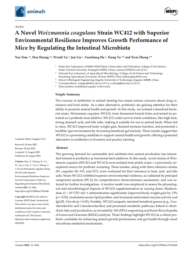 本网讯(通讯员 余翔)2025年8月,SCI期刊《Animals》(中科院2区)发表yl23455永利官网余翔博士的最新研究成果。论文题为“A Novel Weizmannia coagulans Strain WC412 with Superior Environmental Resilience Improves Growth Performance of Mice by Regulating the Intestinal Microbiota”。yl23455永利官网研究生肖雪和华中农业大学博士研究生黄昊为共同第一作者,余翔博士和荆楚理工学院张喜才博士为共同通讯作者,yl23455永利官网食用野生植物保育与利用湖北省重点实验室为第一通讯单位。