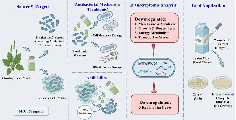 本研究团队发现,车前草提取物对蜡样芽孢杆菌标准菌株及临床耐药菌株均表现出显著的抗菌活性,其最小抑菌浓度(MIC)低至 50 μg/mL。通过深入的功能与机理研究,团队揭示了该提取物独特的“三管齐下”作用模式:(1)破坏菌体结构:直接损伤细菌细胞膜完整性,并干扰细胞内基因组DNA与蛋白质的正常状态。(2)瓦解生物膜堡垒:不仅能抑制浮游菌生长,更能强力清除已形成的生物膜,使其生物量降低超过 77%,并有效降解胞外聚合物等关键基质成分。(3)干扰核心生理功能:转录组学分析表明,提取物能广泛影响细菌的中心代谢、毒力基因表达和物质转运系统,并特异性下调多个关键的生物膜形成相关基因。(4)尤为重要的是,团队在模拟食品体系(脱脂牛奶) 中验证了其应用潜力。仅添加 1 mg/mL的提取物,即可在 24 小时内完全抑制牛奶中蜡样芽孢杆菌的生长,展现出良好的实际应用前景。
