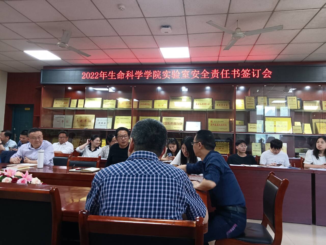 2022年5月5日下午,应国资处等部门要求,实验室安全责任书签订会在生科院8306会议室顺利召开,yl23455永利官网书记陈雄文、院长侯建军、副院长陈亮、副院长涂俊铭以及全体教师出席会议。