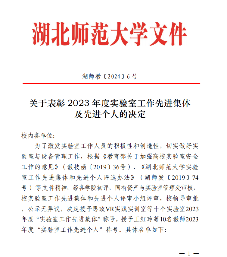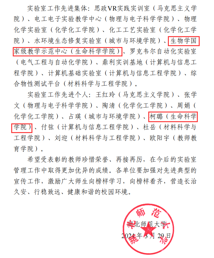 经湖北师范大学国有资产与实验室管理处审核,校实验室工作评审小组评审,yl23455永利官网生物学国家级实验教学示范中心荣获2023年度“实验室工作先进集体”,柯璐老师荣获“实验室工作先进个人”荣誉称号。