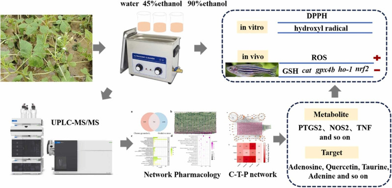 为探究白花菜提取物的抗氧化功效及作用机制,研究团队分别以水、45%乙醇、90%乙醇为提取溶剂,整合体外与体内抗氧化模型、代谢组学、网络药理学及分子对接技术,系统比较了不同溶剂提取物的抗氧化活性。结果表明,白花菜提取物具有显著的抗氧化能力,其中90%乙醇提取物的效果最为突出。体外实验显示,该提取物具备较强的DPPH自由基和羟基自由基清除能力;体内实验则表明,其可显著降低由过氧化氢诱导的斑马鱼体内活性氧累积,恢复谷胱甘肽水平,并调控抗氧化相关基因的表达。进一步分析揭示,其抗氧化作用主要依赖于槲皮素、腺苷、牛磺酸、腺嘌呤等核心成分,通过调控PI3K-Akt信号通路,作用于PTGS2、NOS2、TNF等关键靶点,呈现出多成分、多靶点的协同作用特征。本研究系统阐明了白花菜抗氧化的物质基础与潜在分子机制,为其作为功能性食品的开发提供了理论依据。